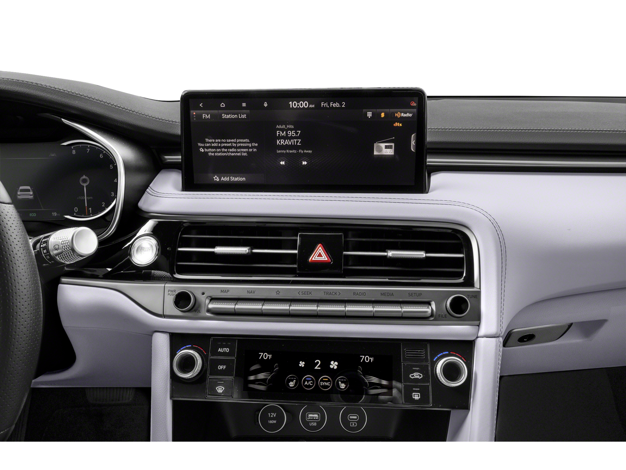 - Radio: AM/FM/HD Audio System -inc: 6 speakers, 5th generation navigation system w/10.25" touchscreen, dynamic voice recognition, connected routing, over the air updates, Android Auto and Apple CarPlay, USB connectivity, SiriusXM satellite radio w/90-day trial subscription (not available in Alaska or Hawaii), Genesis connected services, Bluetooth® hands-free phone and audio streaming system