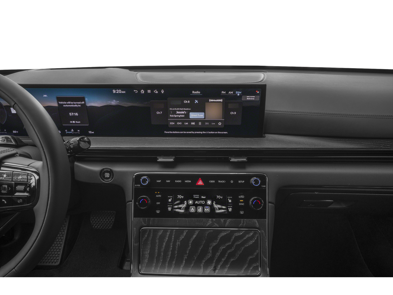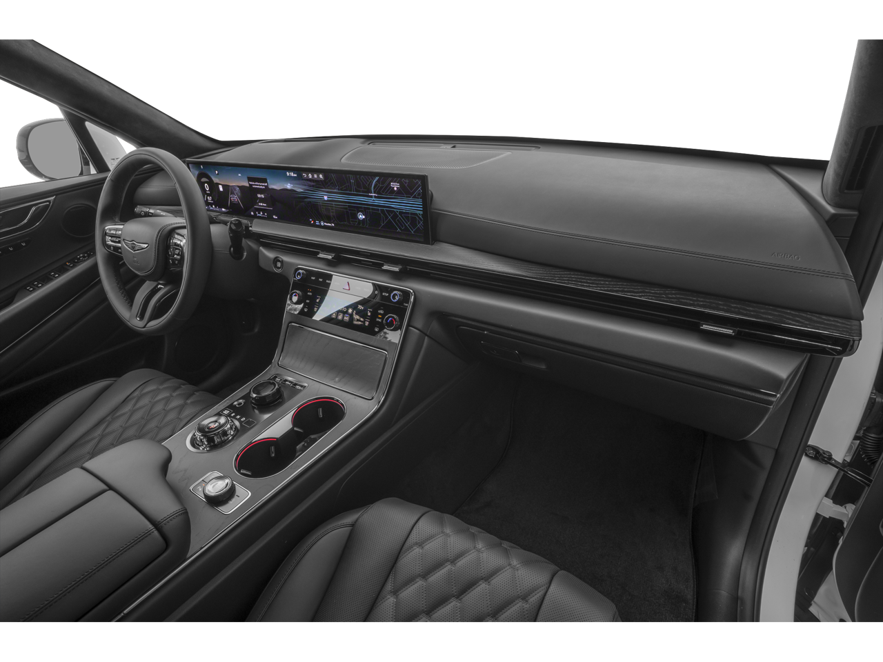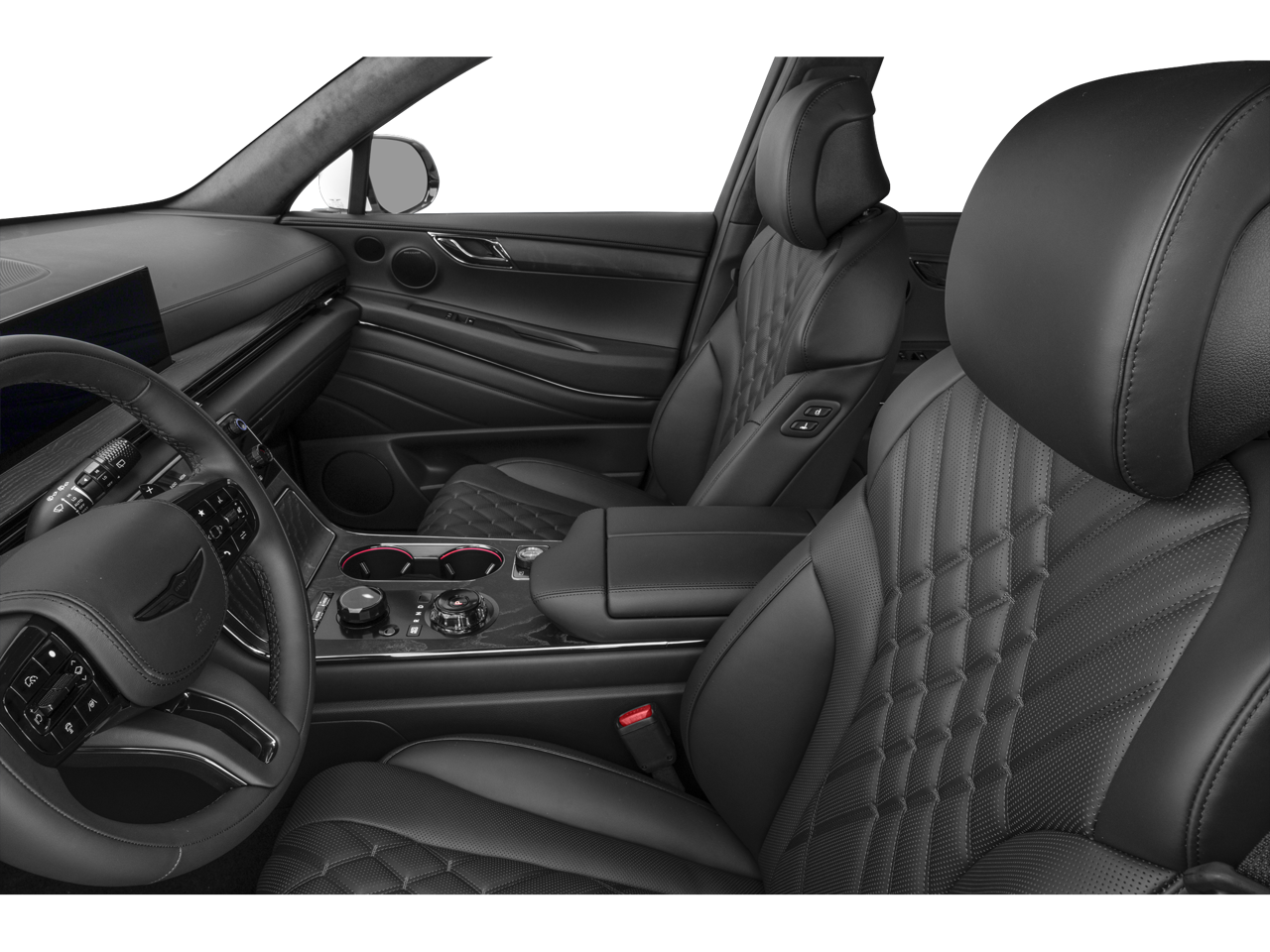 - Radio: AM/FM/HD Bang & Olufsen Sound System -inc: 1400 watts, 18 speakers, 14 channel amplifier, 27" integrated OLED instrument cluster and navigation system, SiriusXM Radio w/90-day subscription (not available in AK or HI), cloud connected platform (cloud profiles, connected routing, dynamic voice recognition, OTA updates), wireless Apple CarPlay, wireless Android Auto, Bluetooth® hands-free phone system w/audio streaming, wireless phone charger, Wi-Fi hotspot, steering wheel controls, USB, Genesis Connected Services, black anodized aluminum speaker grilles and Prestige Black-exclusive infotainment welcome screen/theme