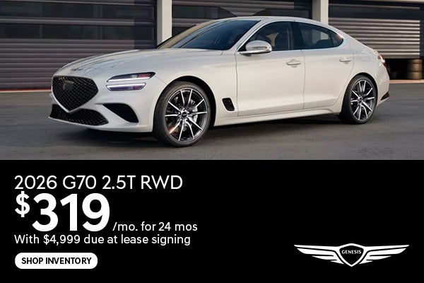 Excludes registration, tax, title and license. No Security deposit required. For well-qualified lessees only. Offer shown based on starting MSRP of $43,450 for MY26 G70 2.5T RWD 2.5L 4-CYL AUTOMATIC TRANSMISSION (model #R0422A45) with freight, $2,500 Retailer Contribution. Retailer Contribution may vary and could affect lease payment. MY26 G70 2.5T RWD 2.5L 4-CYL AUTOMATIC TRANSMISSION close end lease offered through Genesis Finance and subject to credit approval. Available on new MY26 vehicles in retailer stock only. Not all lessees will qualify. Actual net capitalized cost of $39,410 includes $750 acquisition fee. At lease end, lessee responsible for excess wear and mileage at $.25/mile over 12,000 miles/year. Ultra-low mileage lease. Option to purchase at lease-end price negotiated at signing. Not all customers will qualify. Retailer price may vary. Must take delivery from new retail stock by 2/2/26. See dealer for other restrictions and complete details. Not responsible for misprints. Offer expires 2/2/26.