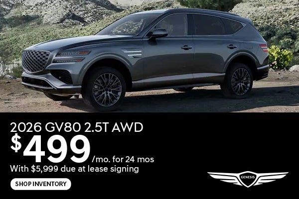 Excludes registration, tax, title and license. No Security deposit required. For well-qualified lessees only. Offer shown based on starting MSRP of $57,700 for MY26 GV80 2.5T RWD 2.5L 4-CYL AUTOMATIC TRANSMISSION (model #V0402R45) with freight and $3,300 Retailer Contribution. Retailer Contribution may vary and could affect Lease payment. 26MY GV80 2.5T RWD 2.5L 4-CYL AUTOMATIC TRANSMISSION close end lease offered through Genesis Finance and subject to credit approval. Available on new MY26 vehicles in retailer stock only. Not all lessees will qualify. Actual net capitalized cost of $54,551 includes $750 acquisition fee. At lease end, lessee responsible for excess wear and mileage at $.25/mile over 12,000 miles/year. Ultra-low mileage lease. Option to purchase at lease-end price negotiated at signing. Not all customers will qualify. Retailer price may vary. Must take delivery from new retail stock by 2/2/26. See dealer for other restrictions and complete details. Not responsible for misprints. Offer expires 2/2/26.